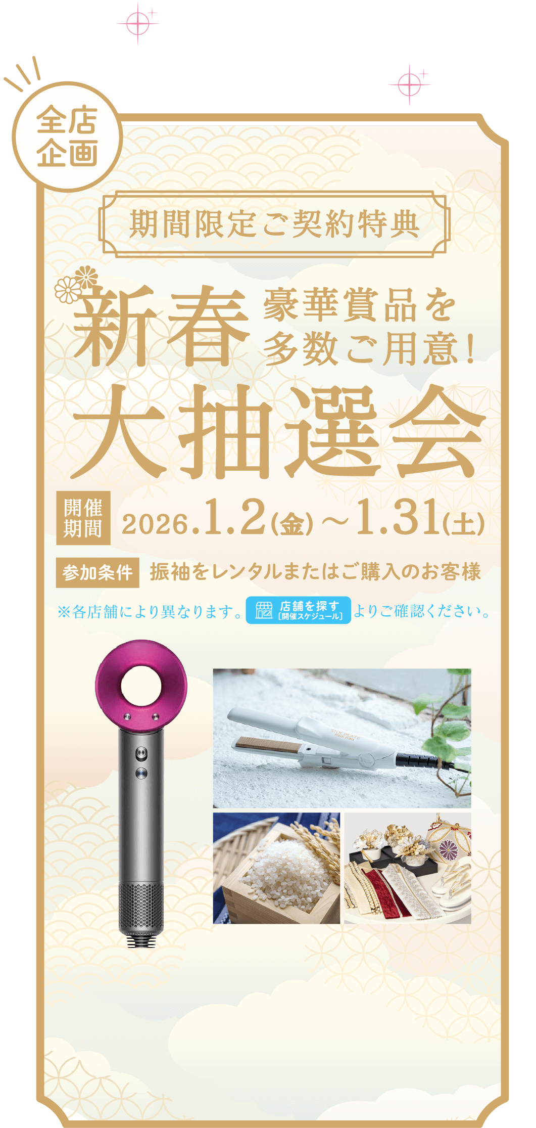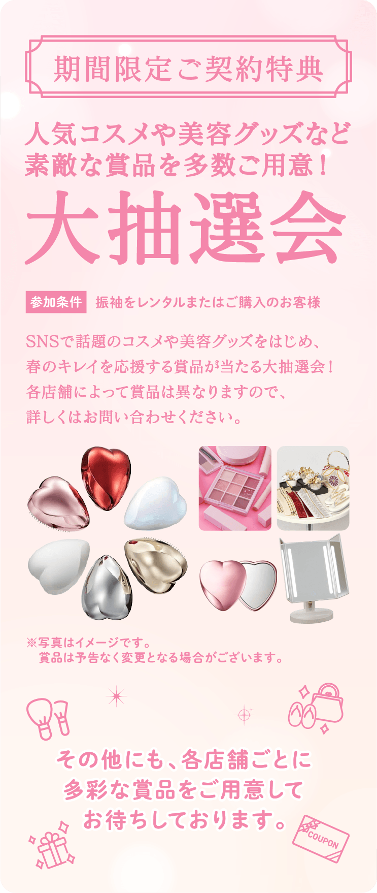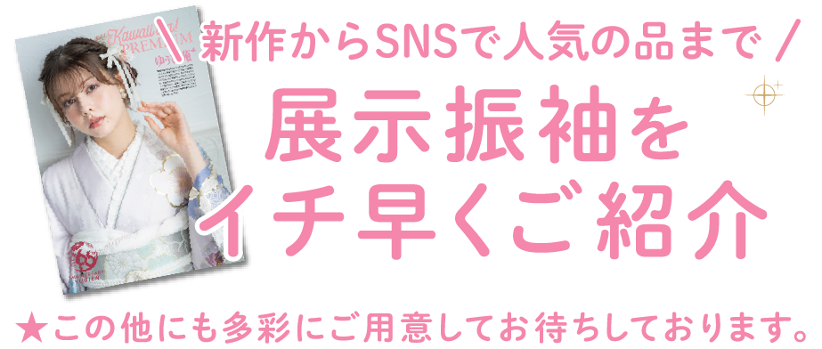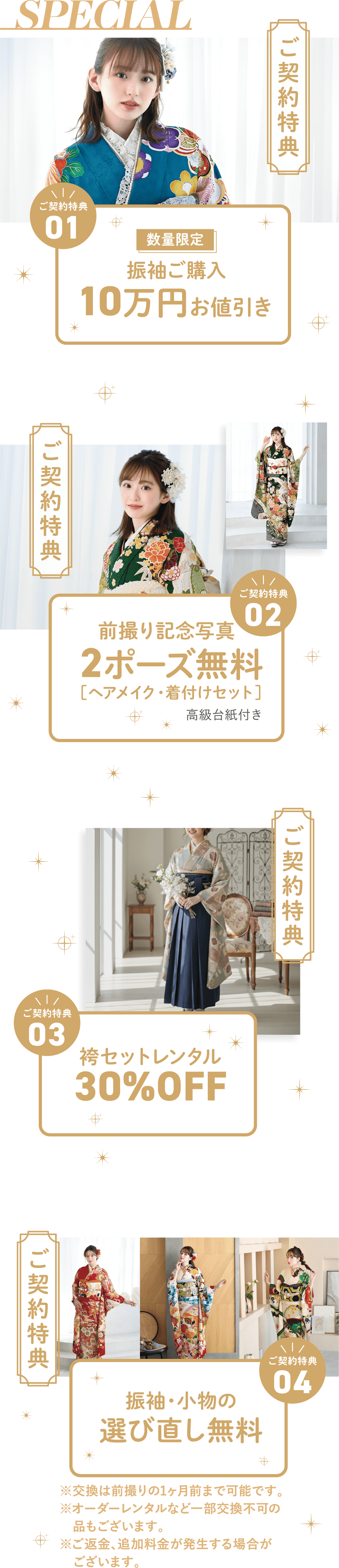 ご購入いただいたお客様のご姉妹の振袖レンタルを最大30%割引、カタログ商品は10%割引(新作除く)させていただきます。